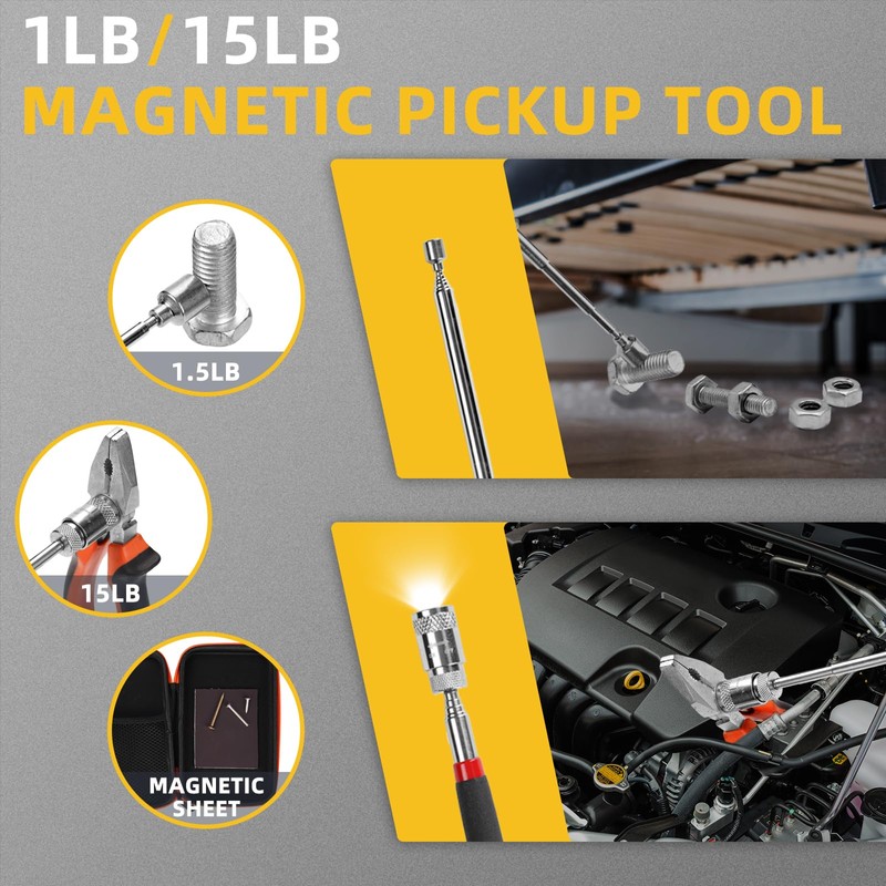 - Widely Application And Repair Helper:These 5pc magnetic pickup tool kit could be used for finding metal nuts, bolts, screws, and other metal pieces; Easily grab nails, pieces, and debri behind HVAC appliances, cabinets, automobile parts, work benches, etc. They are a good helper for home repairs. Make you refuse to bend over to pick up things. Whether he's a seasoned DIY enthusiast or just loves tinkering, this kit is a game-changer.