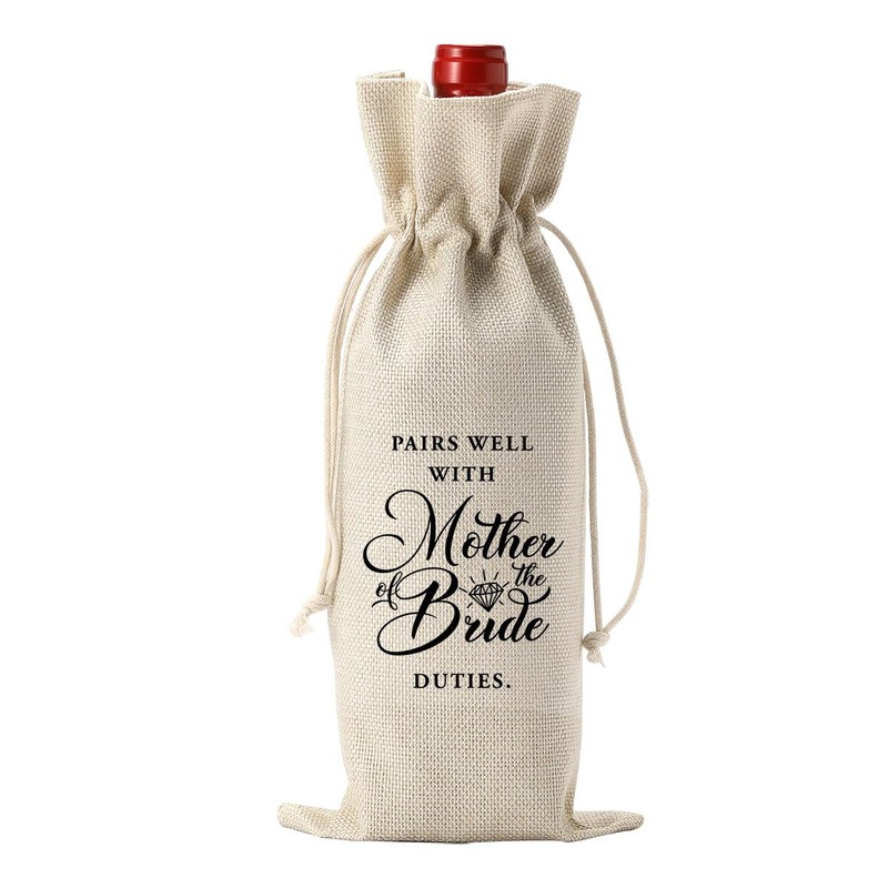 - 【Bride Mother Gifts Ideas】 Don't just stop at bride mother wine bag bottles! This fun bride mother wine bag is the perfect addition to a engagement wedding party, and also it's a perfect gifts idea, as it not only decorates the bottle, but is also suitable for storing all kinds of holiday gifts, make it a must every time you celebrate a variety of festivals and events! Make every gathering a ritual!