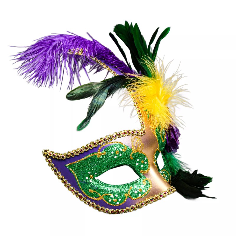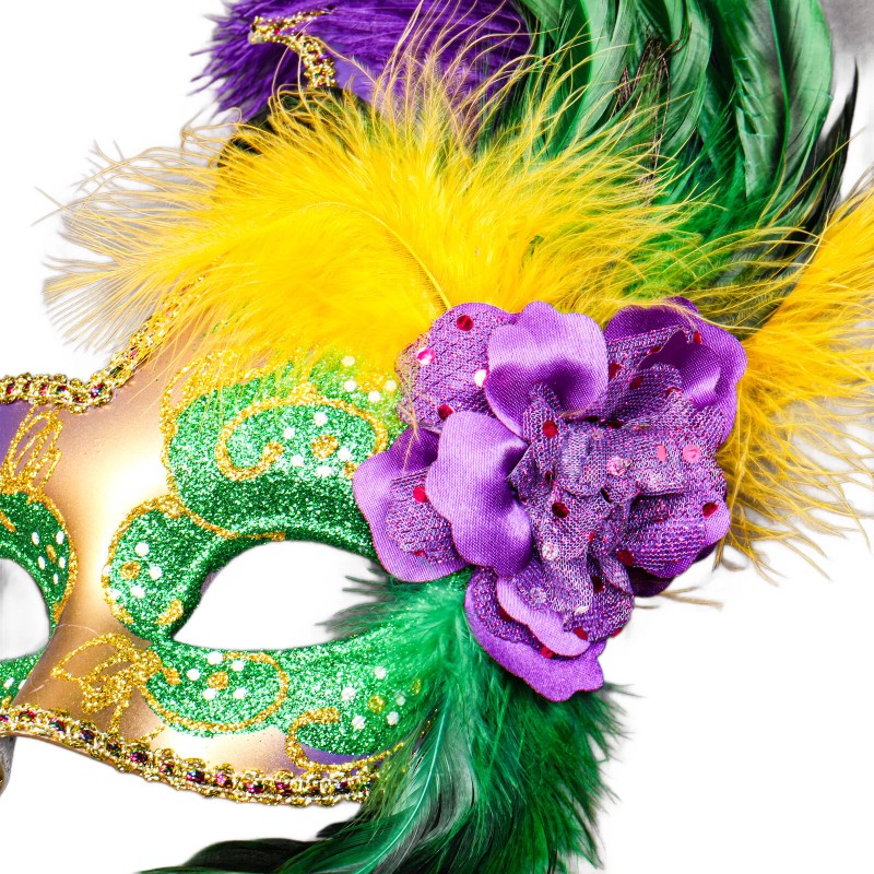 Color: Gold with Colorful Mardi Gras Green Yellow Feather.