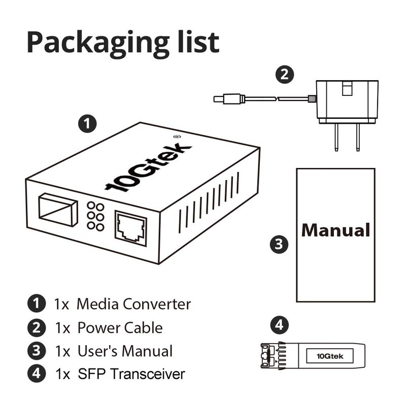- [What You Get] 1x SFP Gigabit Ethernet Media Converter, 1x 1000Base-EX module, 1x DC Power Adapter, 1x User's Manual. 30-day Money-Back guarantee with 1 Year warranty and lifetime tech support.