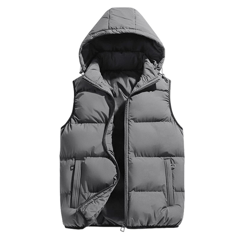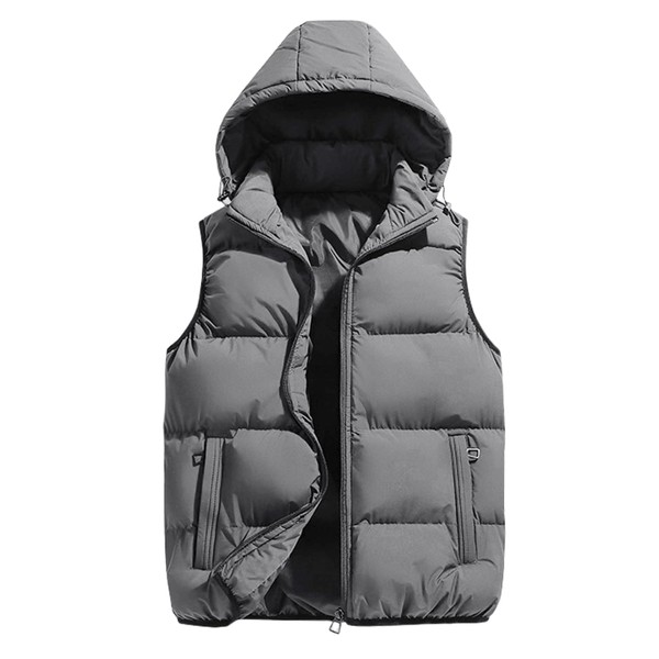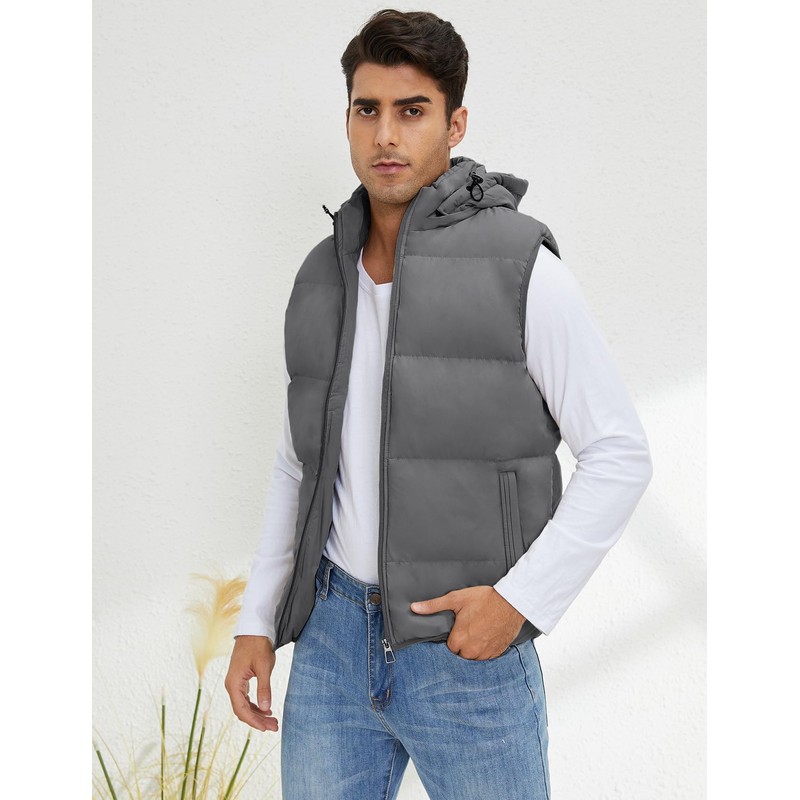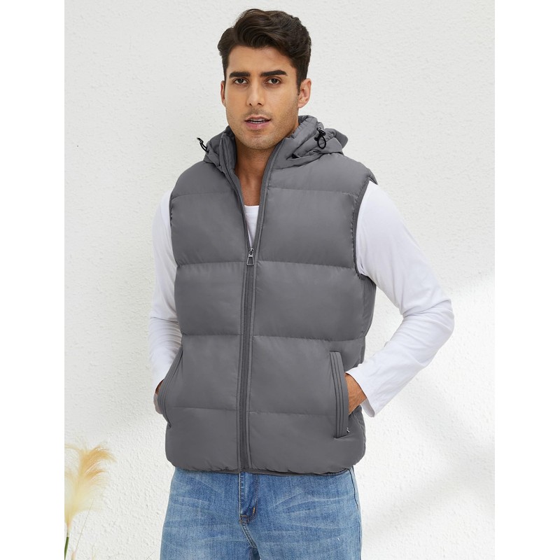 - Design: Men's winter puffer vests, solid color, standard length, full zipper closure, slightly springy bands on the cuffs and hem, two side pockets with zippers, detachable hood with adjustable drawstrings which providing added protection when needed, with its padded design, this vest provides extra cushioning for a cozy fit, ensuring enough comfort during chilly days.