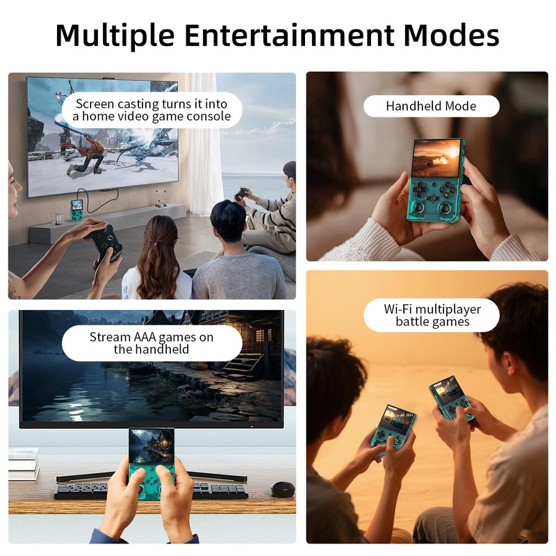 - SEAMLESS CONNECTIVITYThe RG 35XXPro retro gaming console supports HDMI output, vibration motor, WIFI online pairing, streaming, 2.4G wireless and wired controller, expanding your entertainment options beyond gaming.Not only can you enjoy a good game time alone, but you can also call your friends and have fun together.