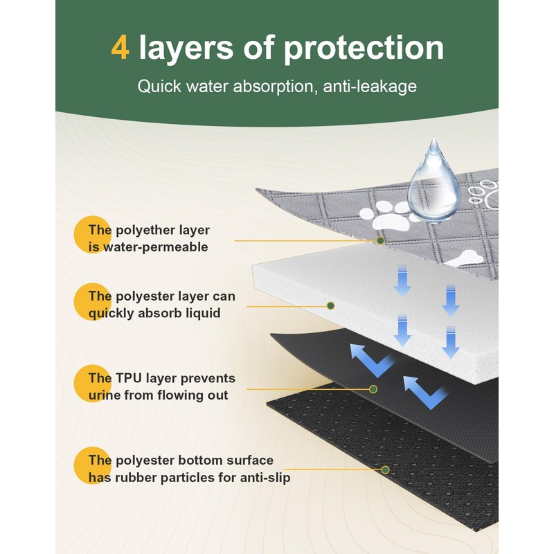 - 4-layer absorption protection, super absorbent: these quick-drying puppy pads have a four-layer design. The top polyester layer absorbs urine quickly, the middle highly absorbent cotton layer keeps the surface dry, and the TPU waterproof layer effectively prevents liquid leakage - keeping the floor clean and dry at all times. The bottom layer ensures that the reusable dog training pads do not slip.