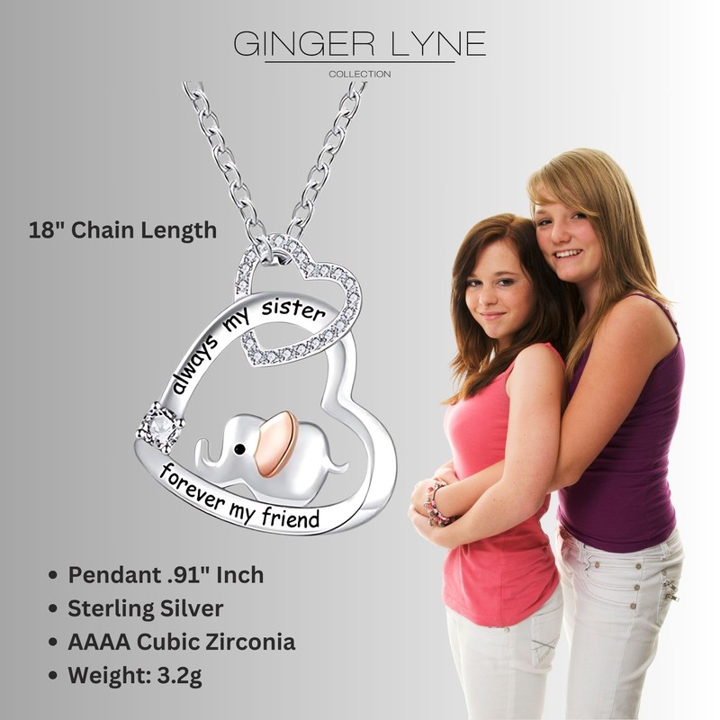Ginger Lyne Collection Sister Necklace for Women | Heart Elephant Necklace for Her | Cubic Zirconia Sterling Silver Pendant Engraved Always My Sister Forever My Friend |18 Inch Rolo Chain
