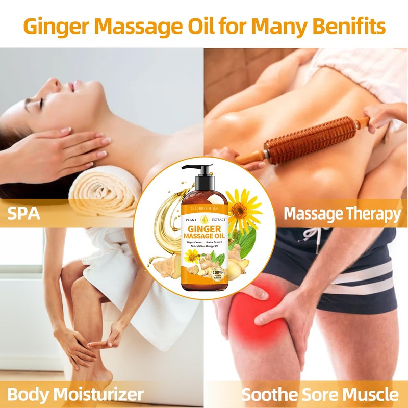 - Lightweight and Multi-Purpose: Our lightweight formula glides on with a smooth finish, the perfect recipe for relaxation or deep tissue massages.The ginger oil is also great for Lymphatic Drainage Gua Sha,Bath, SPA,Massage, Aromatherapy,Candles, Hair Care, Belly Warmer and so on