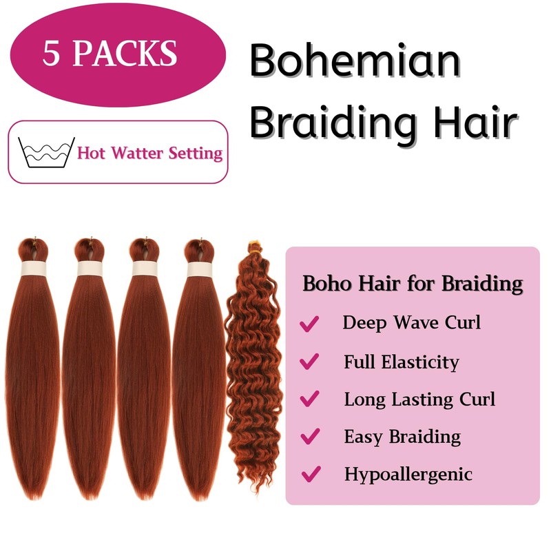 Product Features: High quality low-temperature synthetic material, hot water setting, Yaki material, pre stretched braiding hair, HD color technology, beautiful color ,boho hair for braiding.