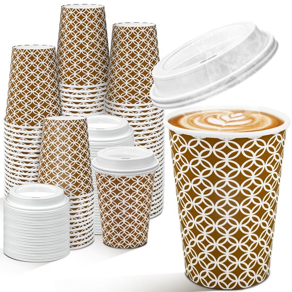 Ginkgo 100 Pack Disposable Coffee Cups with Lids 12 oz, Minimalist Pattern To Go Paper Coffee Cups, Hot Chocolate CoCoa Cups Suitable for Travel, Party, Shops Cafes and Daily use