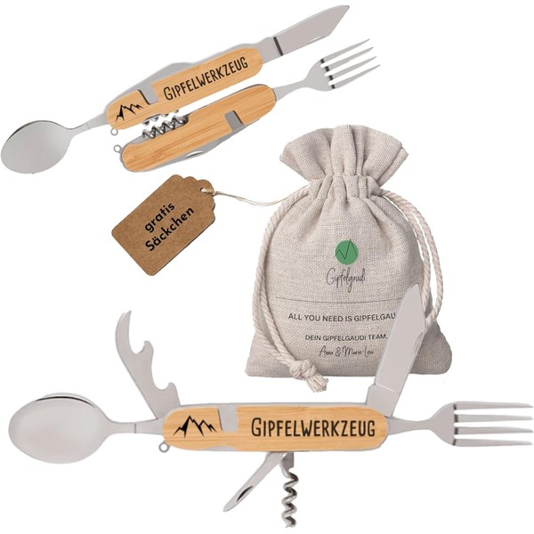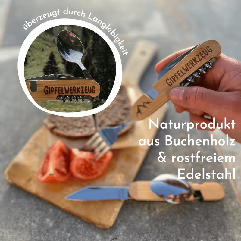 Gipfelgaudi All-in-One Camping Cutlery: Ideal for Hiking, Picnics & More, Plastic-Free Cutlery To Go Made of Rustproof Stainless Steel and Wood