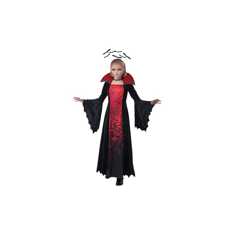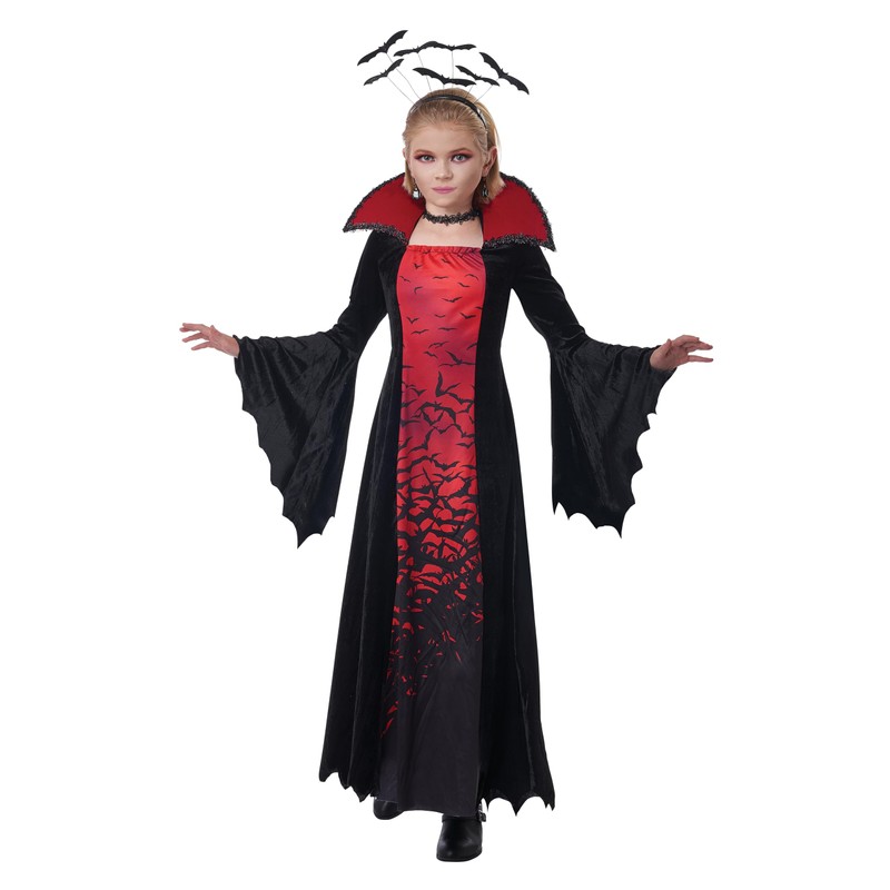 - Costume Includes: Dress with Attached Collar, Bats Headpiece, Ribbon Choker