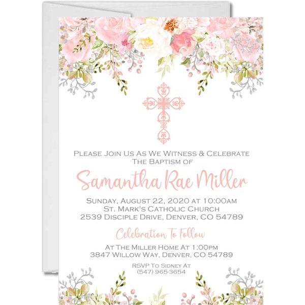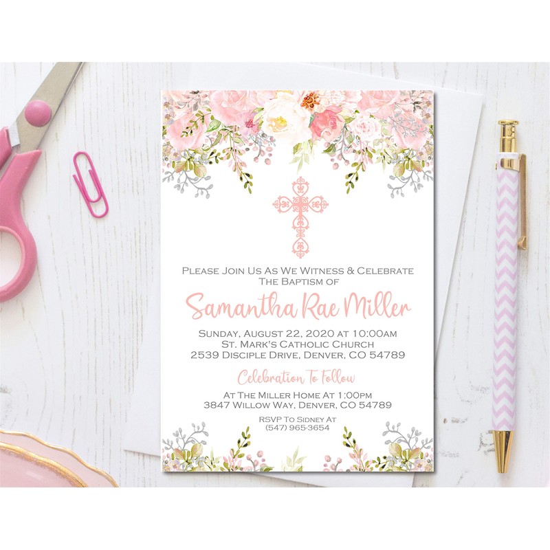 Girls Pink Floral Invitations For Baptism, Christening, First Communion, Confirmation Or Baby Dedication