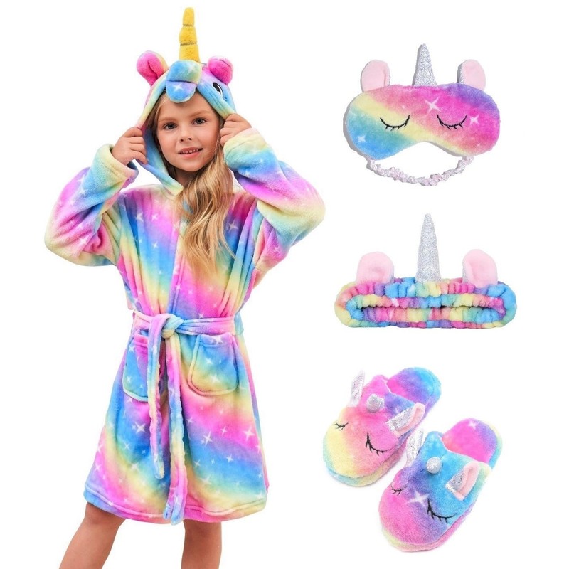 - Includes: 1 robe, 1 pair of unicorn slippers, 1 blindfold and 1 headband.
