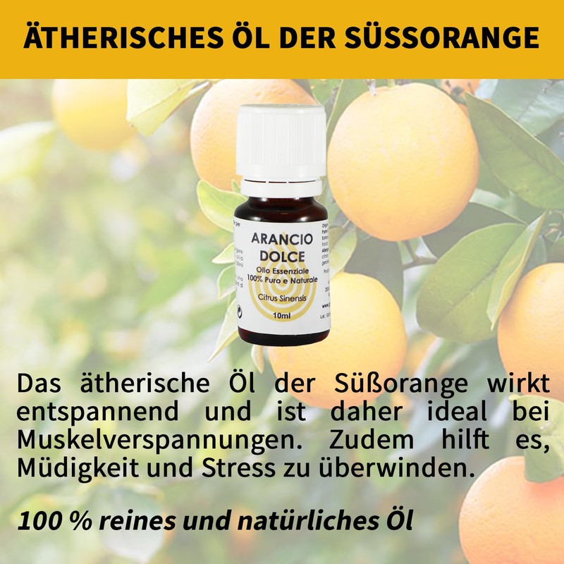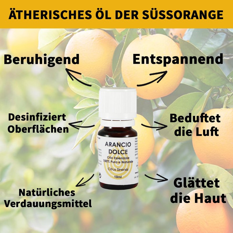 - PERFEKT FÜR: Das ätherische Süßorangenöl ist bekannt für seine erfrischenden und beruhigenden Eigenschaften, die helfen, die Entspannung zu verbessern und den Schlaf bei Schlaflosigkeit zu fördern. Es eignet sich auch hervorragend in der Küche für die Zubereitung von Desserts. Für eine Aromatherapie in 360°.