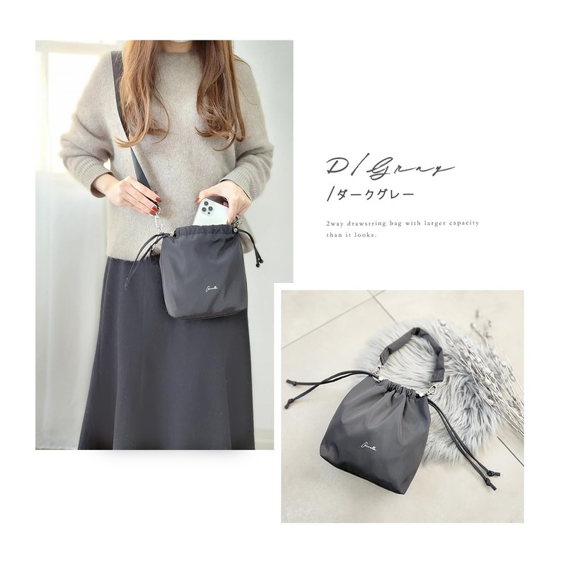 - Compact 2-way drawstring bag with a simple design. Squeeze the drawstring bag for a cute look. You can put your purse, mini wallet, card case, key case, etc. Small enough to fit your daily essentials neatly