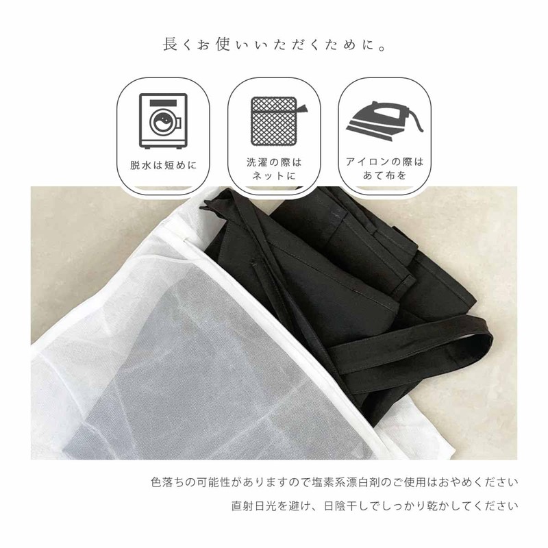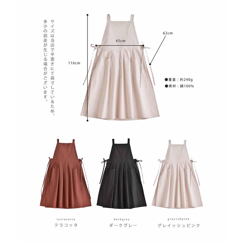 - A loose-fitting one-piece apron that can be worn quickly and is made of smooth and comfortable cotton material. The side ribbon can be tied in the front or back. You can enjoy your own style depending on how you tie it. This functional apron is easy to move around without being too tight