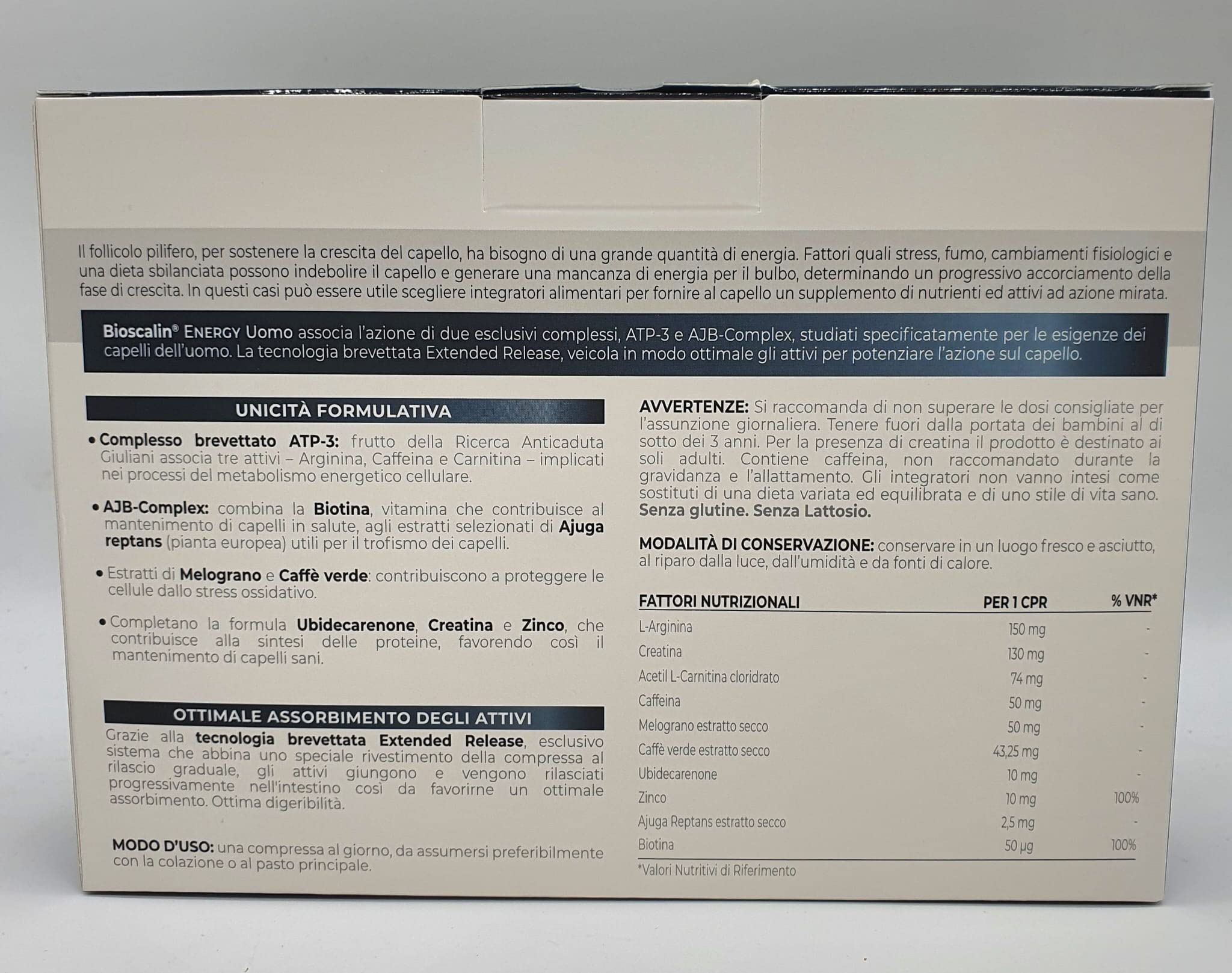 Composition for 1 tablet BIOSCALIN® Energy 30 Tablets: L-Arginine hydrochloride 150 mg., Creatine 130 mg., Bulking agents: Microcrystalline cellulose; Acetyl L-Carnitine hydrochloride 50 mg., Bulking agent; Calcium phosphate; Thickener: Hydroxy-propyl-methylcellulose; Caffeine 580 mg., Green coffee (Coffea arabica L) seeds dry extract 43.25 mg., Pomegranate (Punica granatum L) fruit dry extract 37.5 mg., Zinc oxide (contains milk and derivatives) 12 mg., Ubidecarenone 10 mg., Anti-caking agent: Magnesium stearate; Dye: Red iron oxide; Anti-caking agent: Silicon dioxide; Coating agent: Stearic acid; Ajuga (Aijuga Reptans L.) leaves dry extract 1.25 mg. , Hyaluronic acid, Biotin 50 µg.