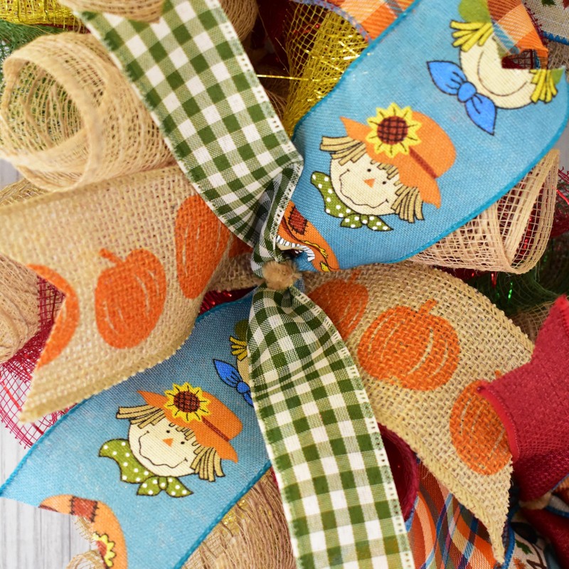 - Warm Seasonal Colors – Burlap, green and deep red mesh with ribbons in plaid, scarecrow, pumpkin, gingham, and solid harvest shades.