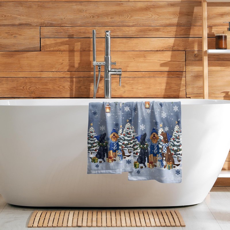 Giwawa Winter Dog Towel Set of 2, Christmas Trees Snowman Presents Funny Puppy Decorative Hand Towels, Xmas Snow Scene Soft Microfiber Face Towel Washcloth for Bathroom Guest Gym Spa Hotel
