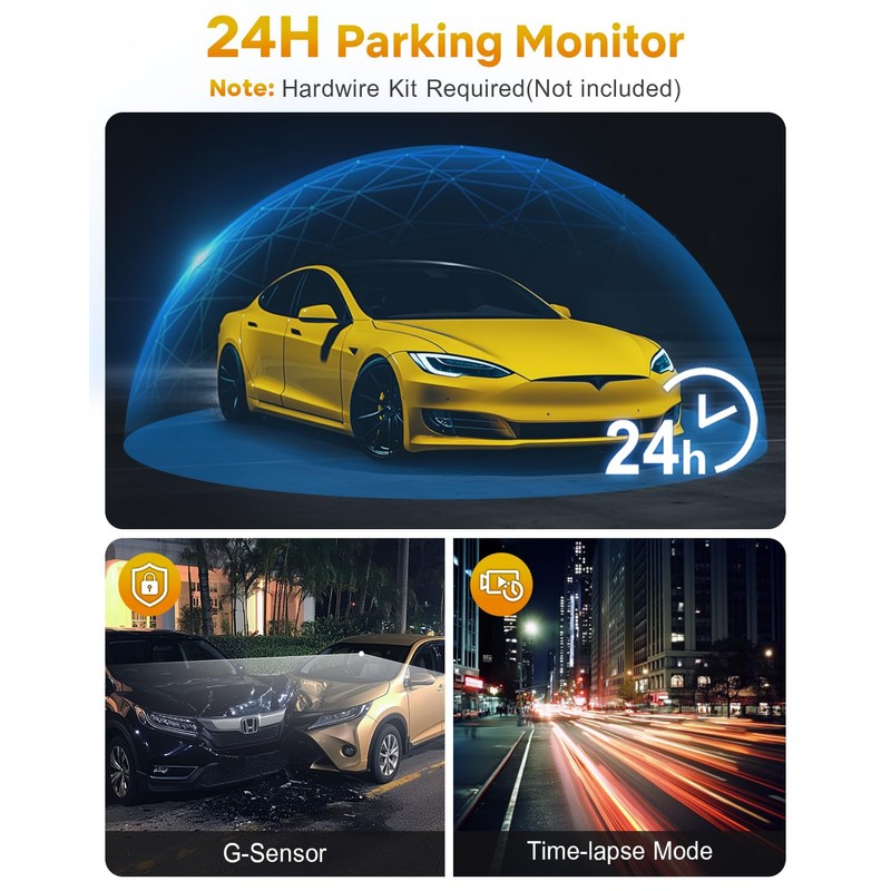 • 🕒【24-Hour Parking Mode】This dash camera for cars supports 24-hour parking mode and impact detection.While your vehicle is parked, footage is automatically recorded by dash camera—providing valuable evidence and added peace of mind. Please note that the hardwire kit is not included in the package, please contact us to obtain it.
