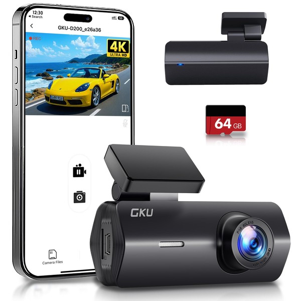 GKU 4K Dash Cam,Dash Cam Front with UHD 2160P, DashCam Built-in WiFi, Front Dash Cam with 24H Parking Monitor,Night Vision,WDR,170° Wide Angle,Loop Recording,G-Sensor,DashCam Includes 64GB SD Card,Supports 256GB Max