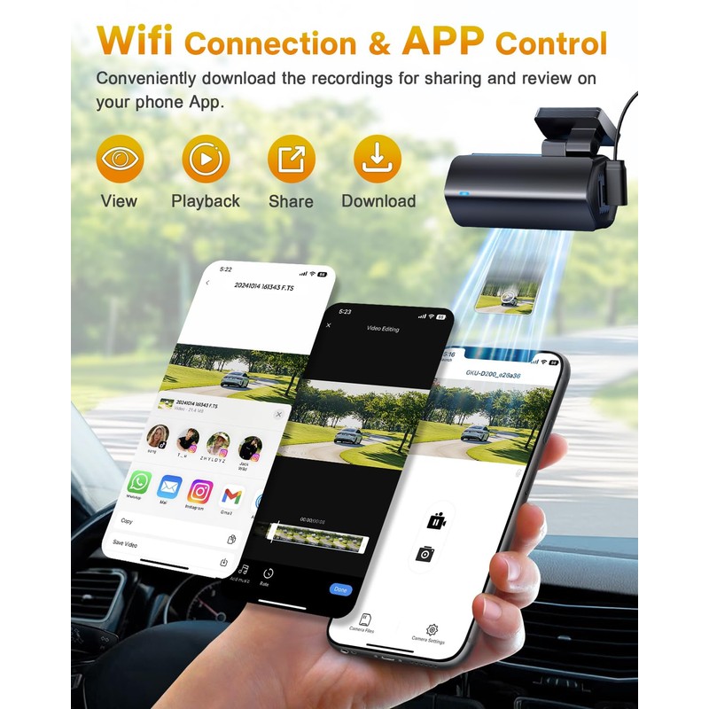 • 📱【Built-in WiFi & App Control】This dash cam features built-in WiFi, making it easy to connect directly to your smartphone. With the app, you can view, download, and manage recordings on your phone, ensuring fast and effortless access to your car dash cam footage.