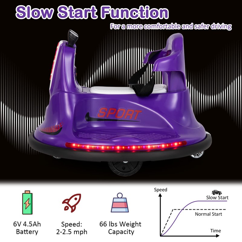 - 360-Degree Spin Wheels: Adopted Slow Start Function, the ride-on bumper car is designed to run 2-2.5 mph for more comfortable and safer driving. This kids ride-on bummer car has 2 directional wheels and 2 swivel wheels to achieve smooth movement and flexible turns. Applicable to various roads, including cement roads, brick roads, asphalt roads, etc.