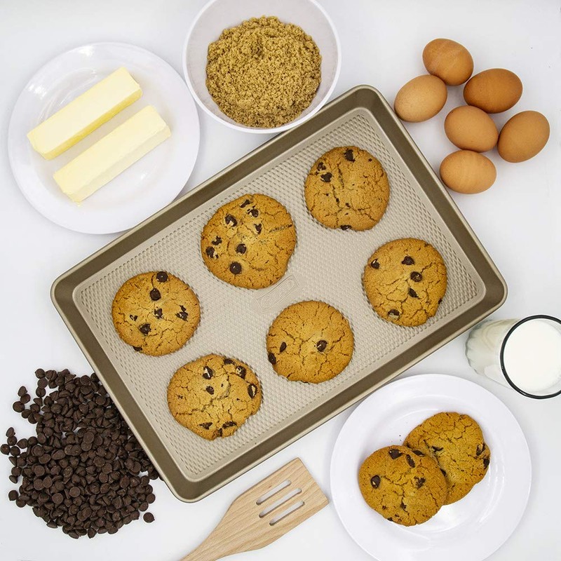 - EVENLY BAKES – This premium baking pan is constructed with a raised diamond texture that increases airflow to promote even baking.