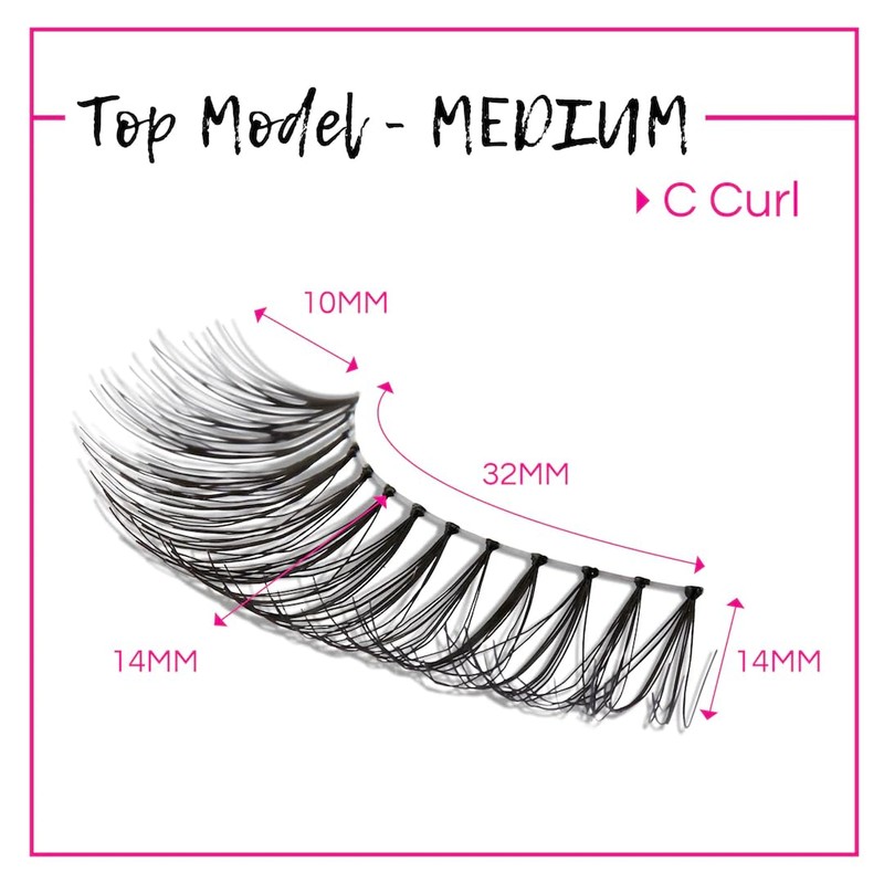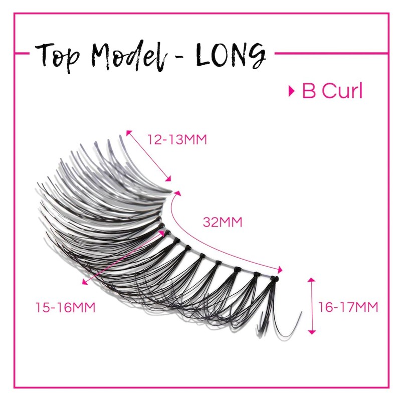 The runway waits! Get a top model look with these striking lashes. Evenly placed cluster groups of lashes on an invisible band offer longer lashes on the outer corner to shorter on the inner corners creating a truly dazzling look. This style comes in short (10-12mm), medium (12-14mm) and long (14-16mm).