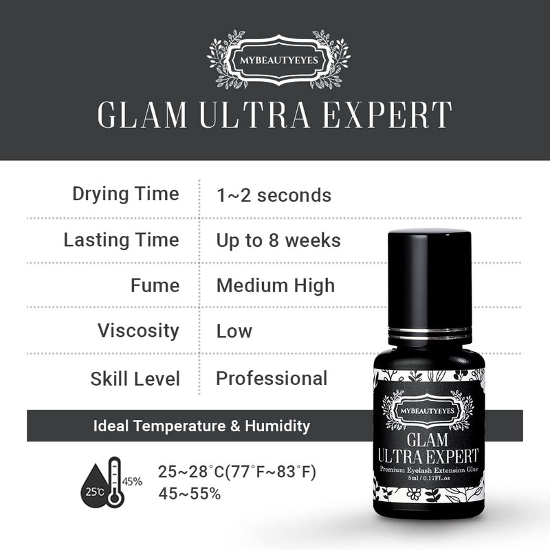 • 1. SHORT DRYING TIME AND LONG LASTING: My Beauty Eyes Glam Ultra Expert Glue has a short cure time of 1 to 2 seconds and a long lasting lifespan of 7 to 8 weeks. Designed for extensions, it can also be used as a classic rush, volume lash, and Russian volume
