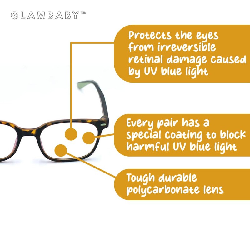 - WHAT'S IN THE PACKAGE: GlamBaby Blue Light Blocking Glasses with impact-resistant Polycarbonate lenses for GlamBabies 3-years and older. Accompanied by a protective microfiber pouch and a collectible microfiber cleaning cloth. These glasses not only shield your child's eyes from harmful UV blue light emitted by digital devices but also ensure their glasses are safe and their vision remains clear with our premium microfiber accessories.