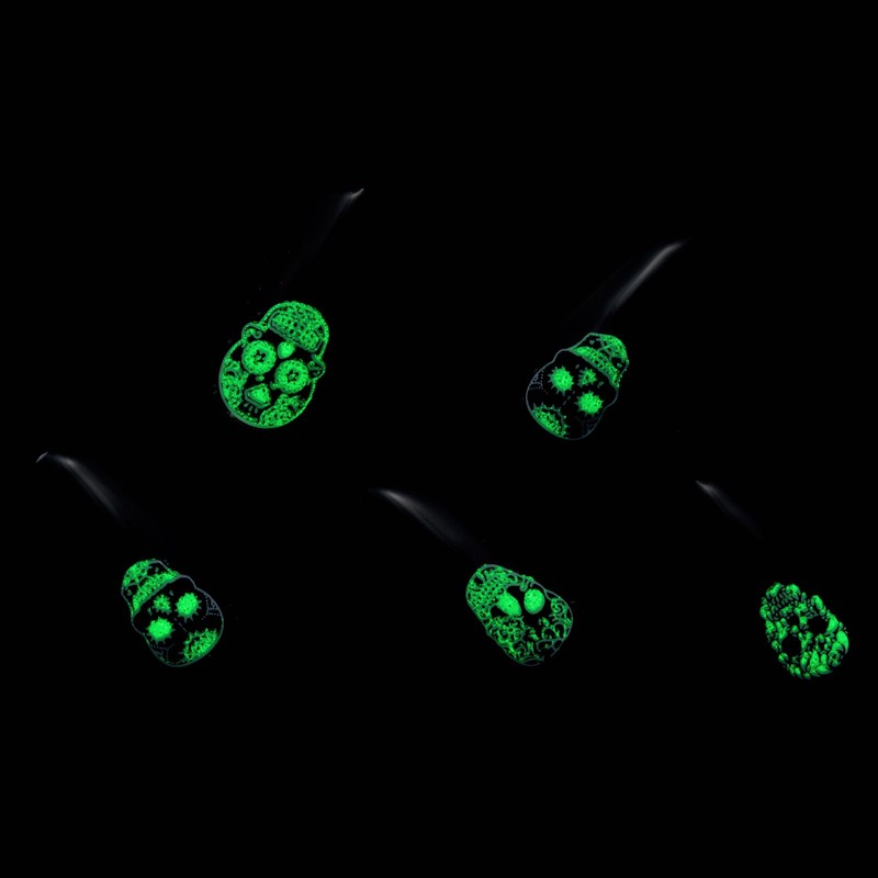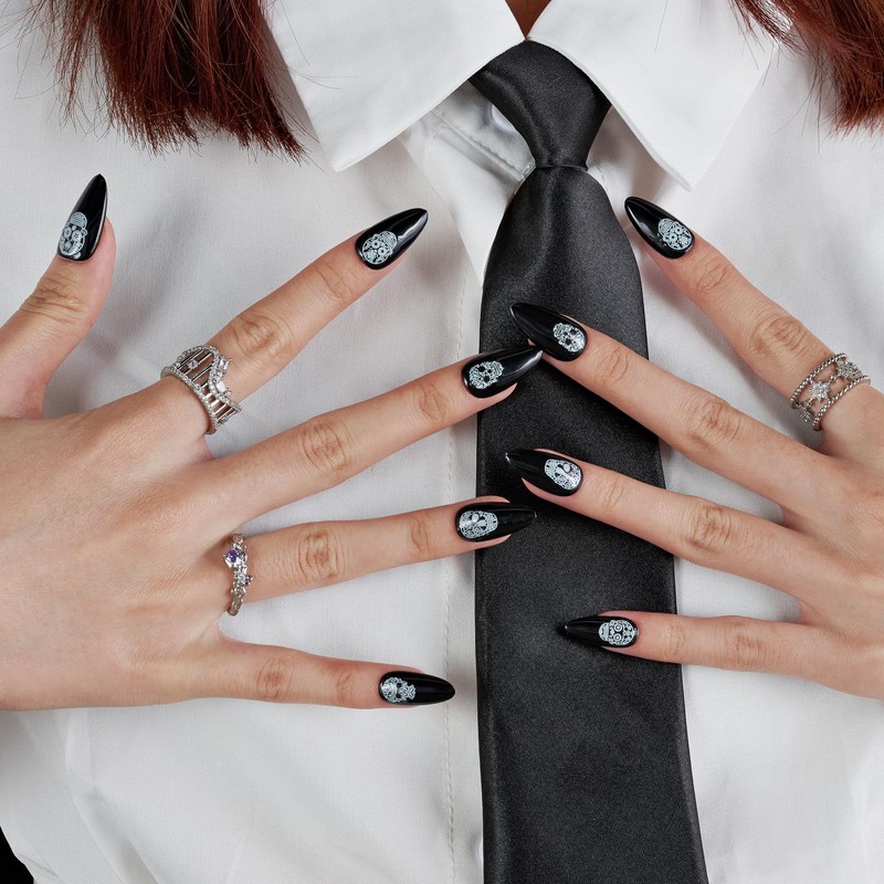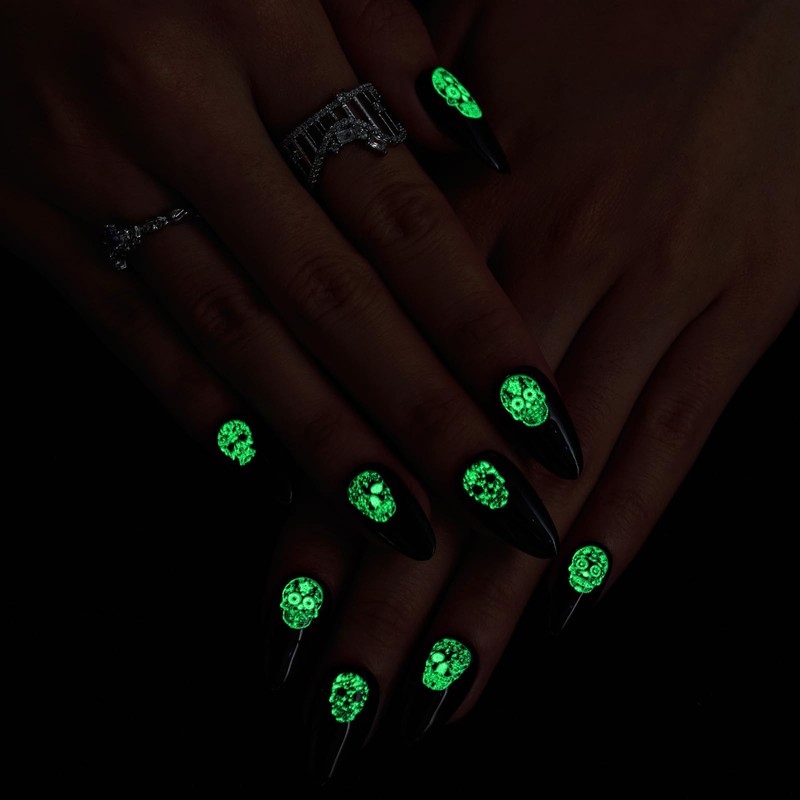 GLAMERMAID Press on Nails Short Almond for Halloween, Gothic Black Luminous Fake Nails Gel with Skull Design Medium Oval Handmade Glue on Nail for Women, Reusable Acrylic False Nail Kits Stick on Nail