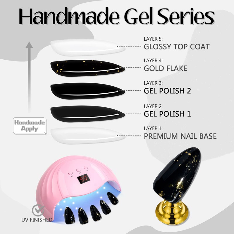 - Handmade gel series nails: GLAMERMAID handmade gel press on nails series not done by machine printing, but by the manicurist's hand applied gel polish layer by layer, "jelly" high shine finish that looks like salon quality are durable, flexible, and easy to apply. You get an added texture that makes this manicure stand out from the crowd