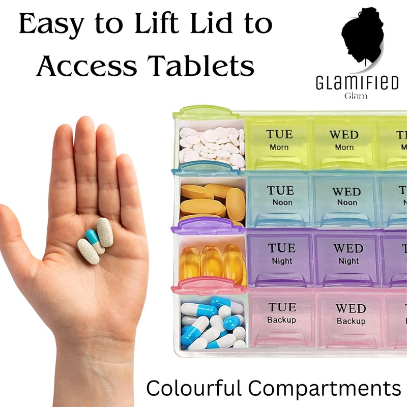 - Organize medications and supplements effortlessly with the Glamified Weekly Pill Box featuring 28 spacious compartments.