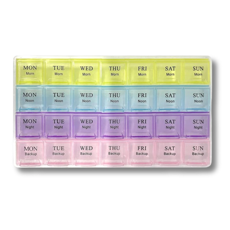 - Designed for convenience, this pill organiser offers 7 days of pill management with 4 compartments per day, perfect for morning, afternoon, evening, and bedtime doses.