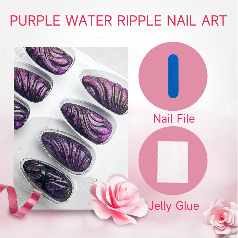 - PRODUCT CONTENT You will get 24 pieces purple false nails with design in 12 different sizes, 1 nail file and 24 jelly glue.