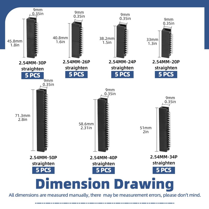 Glarks 35pcs 20/24/26/30/34/40/50 Pin 2.54 mm Pitch Dual Row Straight Box Header Kit, 7 Sizes IDC Socket Connector, IDC Box Headers, Dual Pin Box Headers for PCB Electronic Device Projects