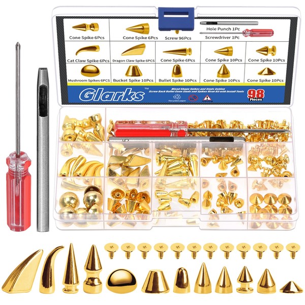 - ★ Package Included ---- In this package, you will receive 96 sets different styles gold spikes studs with screws, 1pc hole punch and 1pc screwdriver. Total 98pcs screwback studs and installation tools to meet your different leathercraft project needs. Coming with a plastic storage box for well sorted storage and easy carry.