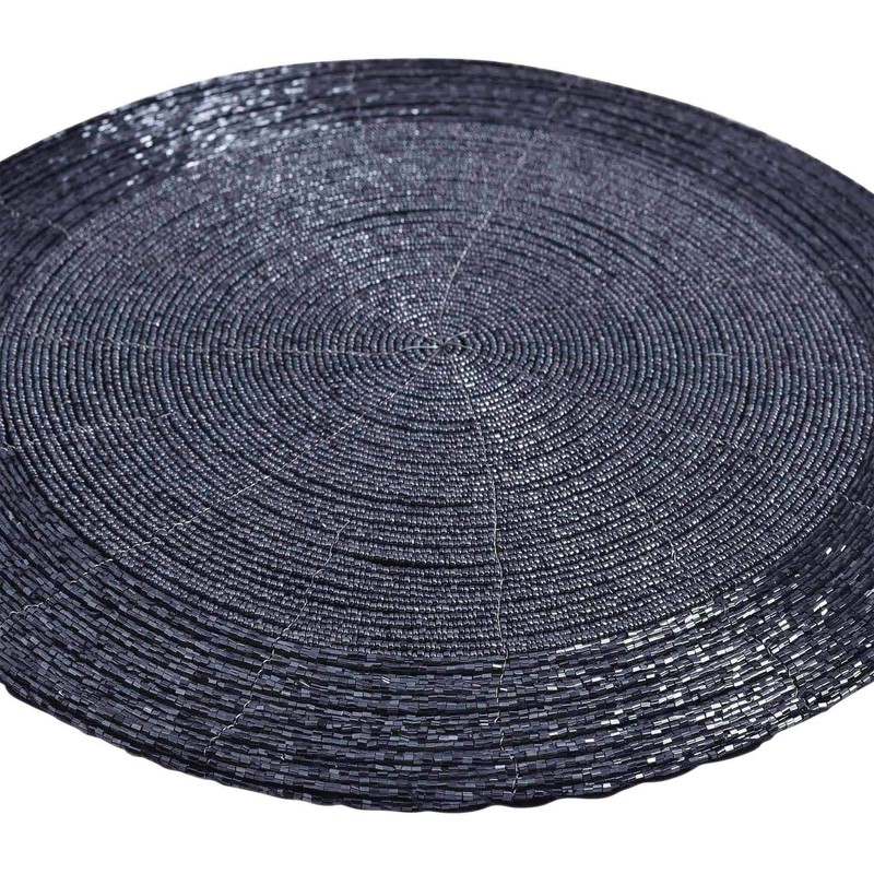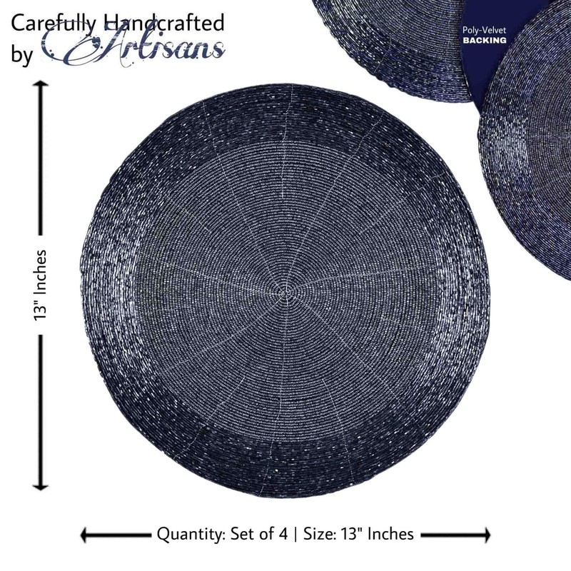 - Material and Size - Trunkin' glass beaded placemats are meticulously handcrafted using glass beads and finished in a poly-velvet. Our round placemats are 14” in diameter and come in sets of 2/4 placemats.