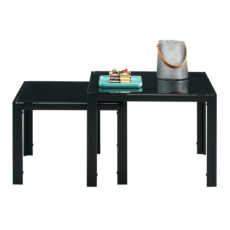 Glass Black Nesting Coffee Table Set of 2, Square Modern Stacking Table with Wood Finish, Industrial End Table Side Tables for Living Room Bedroom Balcony Yard
