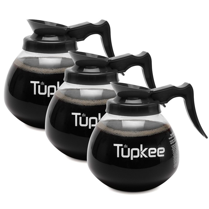 Glass Coffee Pots Decanter Carafe -Glass, 64 oz. 12-Cup, Set of 3 Black Handle + BONUS + Tupkee Coffee Machine Descaler & Cleaning Solution – For Drip Coffee Maker, Espresso and Keurig Coffee Machines