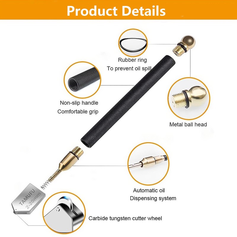 Using our Glass Cutter is a breeze. Simply unscrew the metal ball and infuse oil into the handle. Measure and mark the desired cutting areas with a pen and use the glass cutter to make a precise cut along the marked line. Apply light pressure to break the glass open. When dealing with thicker materials, glass breaking pliers can be used as an aid in the cutting process.