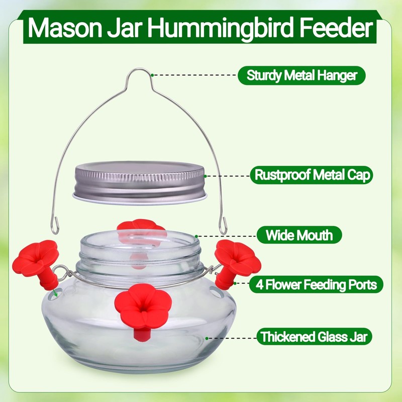 - Mason Jar Hummingbird Feeder: The classic mason jar shape, with its vintage look and modern craftsmanship combines to make both a hummingbird feeder and a decorative garden art piece. This hummingbird feeder blends seamlessly into gardens, patios, or windowsills. Watch sunlight dance through the nectar-filled jar, creating a mesmerizing focal point in your home