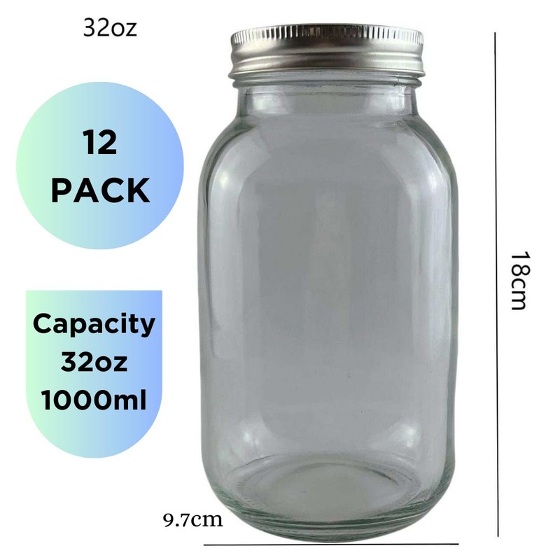 32 OZ Wide Mouth Mason Jars - 12 Pack | BPA-Free Metal Lids | Airtight Sealing for Food Preservation & DIY Projects Upgrade your food storage and kitchen essentials with this 12-pack of 32 OZ Wide Mouth Mason Jars. Made from high-quality, durable glass, these 32 oz glass jars are perfect for a variety of uses, including preserving homemade jams, jellies, honey, and other pantry staples. Ideal for meal prep, overnight oats, or even DIY crafts and home decor, these versatile mason jars are a must-have for every home. The BPA-free metal lids provide a food-grade safe, airtight seal to keep your ingredients fresh for longer periods. Please note that the lids are not recommended for dishwasher use, ensuring their longevity for continued airtight sealing. With their wide-mouth design, these jars allow for easy filling, pouring, and cleaning, making them great for storing dry goods such as beans, grains, and spices, or even using them for fermentation projects. The large capacity of these 32oz glass jars makes them perfect for larger portions of pickles, sauces, or even refreshing beverages like cold-brew coffee and sun tea. Whether you're an avid home canner, a meal prep enthusiast, or looking for stylish, functional storage for your kitchen or pantry, these mason jars will meet your needs. They also make excellent containers for DIY gifts, such as cookie mixes, bath salts, and candles. Product Highlights: Capacity: 32 oz per jar Wide mouth for easy filling and cleaning BPA-free, food-safe metal lids with airtight sealing Perfect for canning, preserving, and fermenting Multi-purpose jars for meal prep, pantry storage, and DIY crafts Dishwasher-safe jars (lid not recommended for dishwasher use) Ideal for storing jams, jellies, honey, dry goods, sauces, and beverages