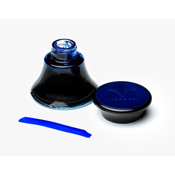 Visconti Blu Calamaio Glass 50 ml. This bottle guarantees an even filling with every single use. Inside there is a handy cylinder that collects the required amount of ink even when the product is scarce, preventing waste. The large cap that reflects the color of the ink serves as a bakelite cap with remarkable heat resistant properties. Features: Line: Ink Bottle - Type: Fountain Pen - Colour: Blue - Use: Charging
