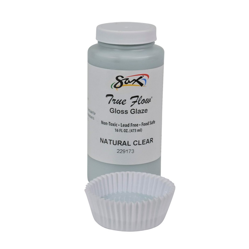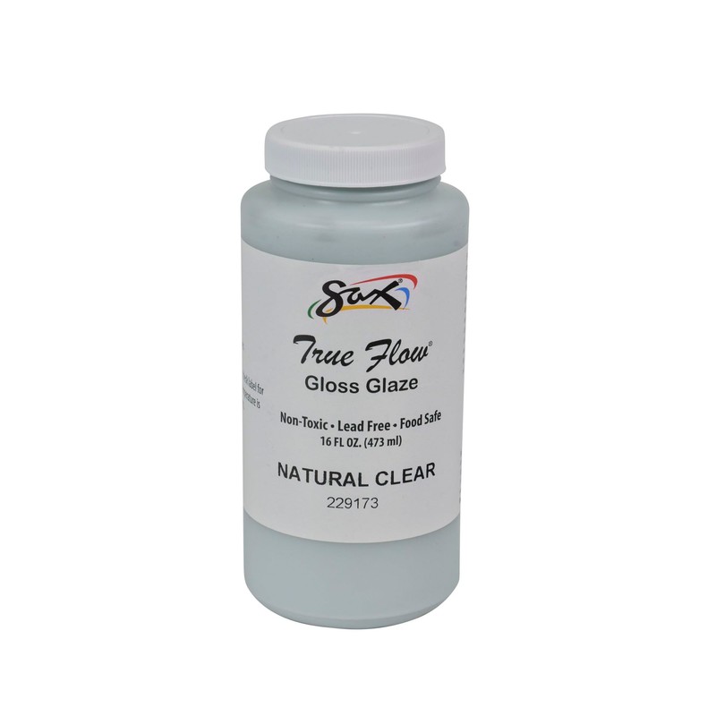 The Sax gloss glaze in translucent Natural Clear is a high-quality glazing paint that's non-toxic and dinnerware safe when fired to cone 06-05. During application, the transparent glaze may be a different color and will change to the desired look after the required kiln firing. The color does not change, but there's a possible surface texture change when fired at cone 6.