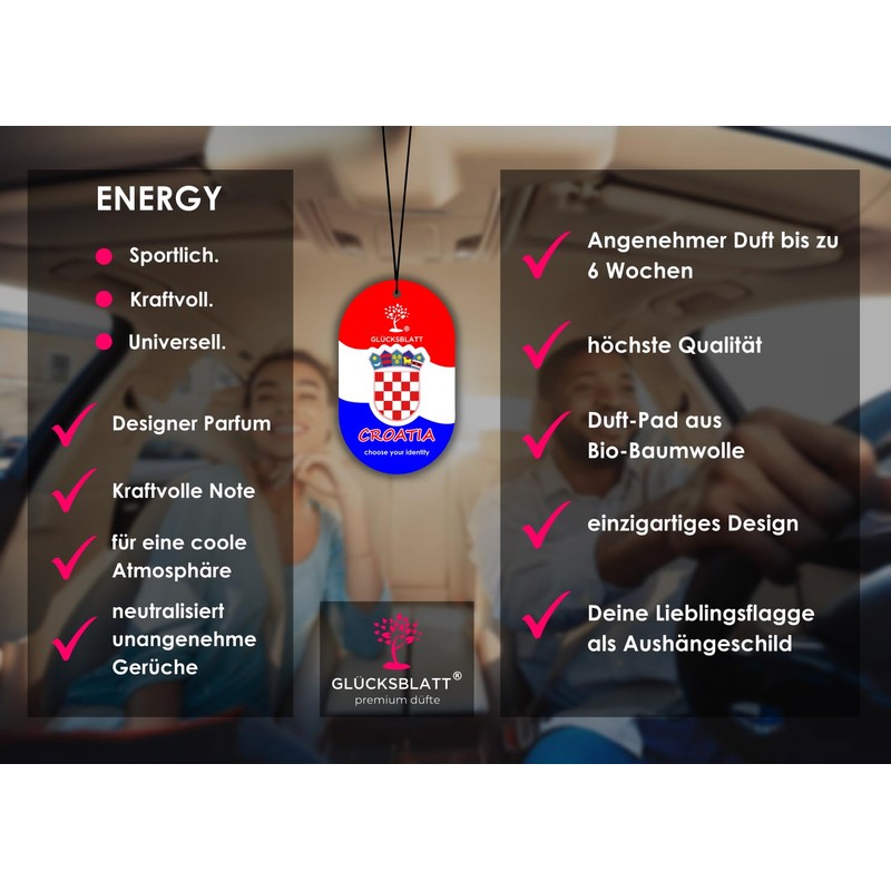 ProduktbeschreibungenWie w?re es mit einem Duft-Baum in Deiner Lieblings-National-Flagge als Aush?ngeschild?! Mit der neuen GLCKSBLATT National-Flag Kollektion unterstreichst Du nicht nur Deine Identit?t, sondern bringst Dein Fahrzeug auf ein neues Duftlevel. Die praktischen Dufttr?ger werden am Rckspiegel frei angebracht und entfalten ein gleichm??ig wohltuendes Duftaroma. Die Duftnote ENERGY wird seinem Namen gerecht. Damit erlebst Du ein langanhaltendes Frische-Feeling, dass sicherlich auch Deine Board-Crew imponiert. ENERGY - Sportlich. Kraftvoll. Universell. Eine kraftvolle Note welche den Sportler in Dir weckt. Der Duft vermittelt eine angenehme Atmosph?re fr Sie und Ihn. Das erfrischende Duftaroma neutralisiert st?rende Gerche und verleiht Deiner Umgebung duftvolle Brillanz.Inhaltsstoffe / ZutatenParfm, Duft-Pad aus saugf?higer Bio Baumwolle, luftdichte Folienverpackung