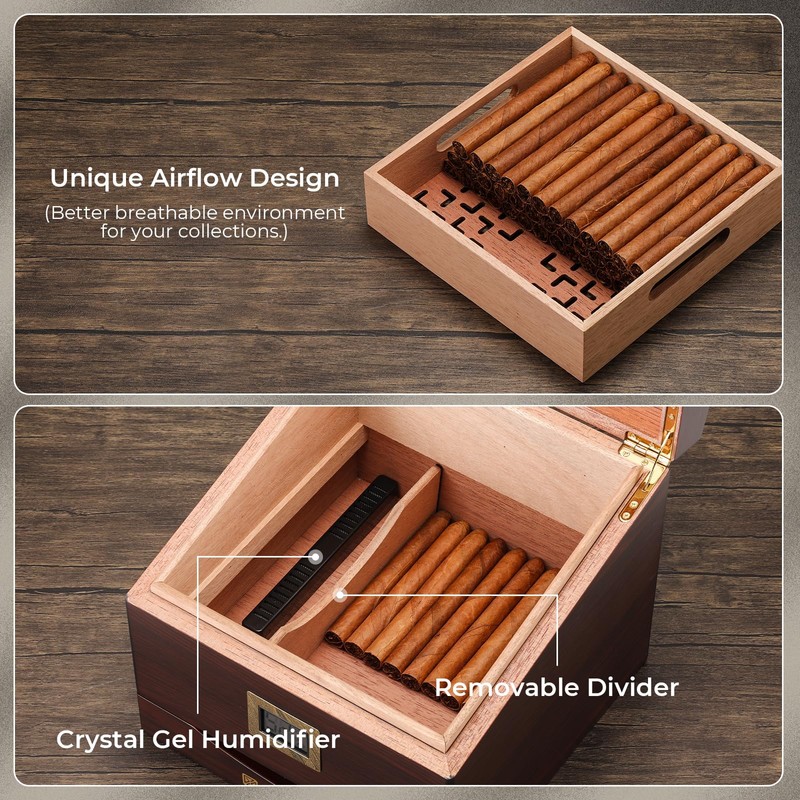 - 【Spanish Cedar】The spanish cedar lining and divider keep your cigars fresh and fragrant; The divider specifically provides a place for the boveda packs; Also the unique airflow design of the drawer gives the cigars a better breathable environment.
