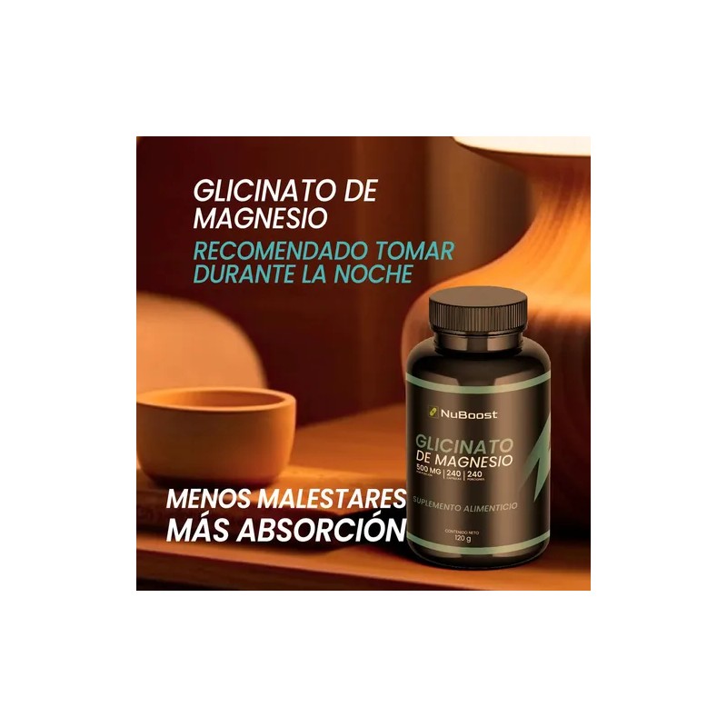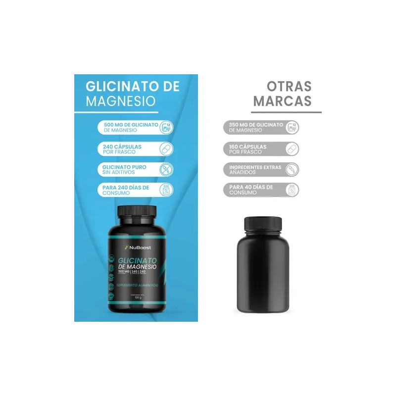 Obtén 500 mg de Glicinato de Magnesio tomando 1 sola cápsula al día. Cada frasco te ofrece 240 cápsulas de Glicinato de Magnesio NuBoost