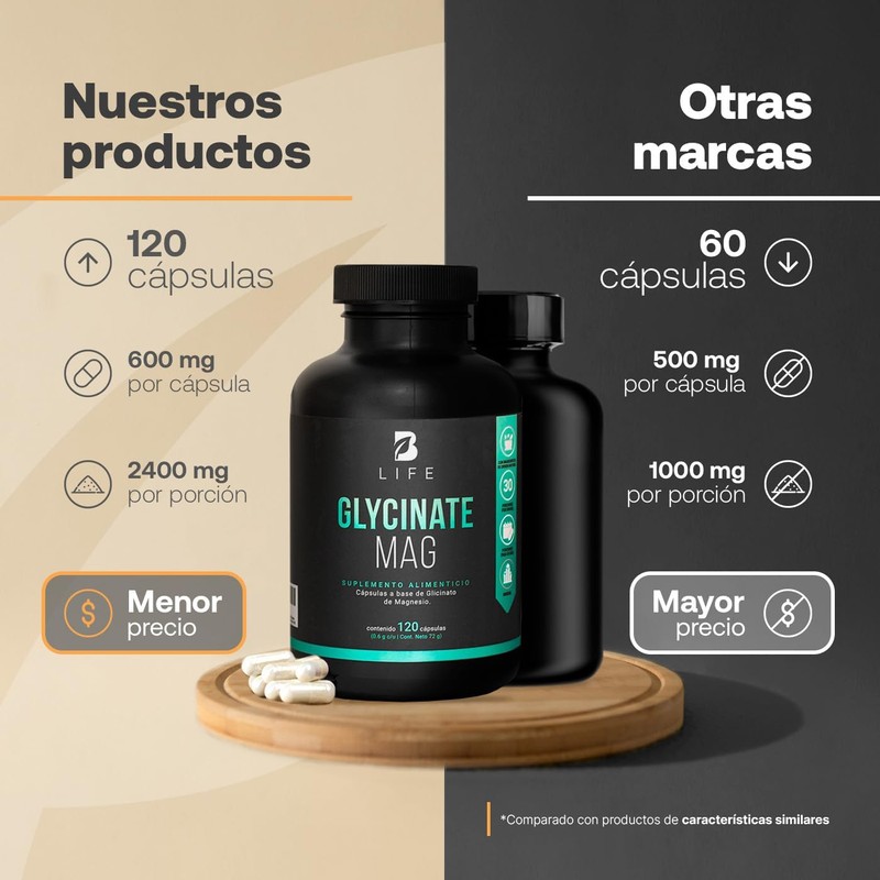 - ¡Descubre el bienestar con Glycinate Mag B Life! Nuestra exclusiva composición aporta una alta absorción y biodisponibilidad en el organismo gracias a su máxima concentración de 408 mg de Magnesio en cada porción, en comparación con otras fórmulas que brindan únicamente 200 mg. Mineral ideal para optimizar tus niveles de energía. Contiene 120 cápsulas.