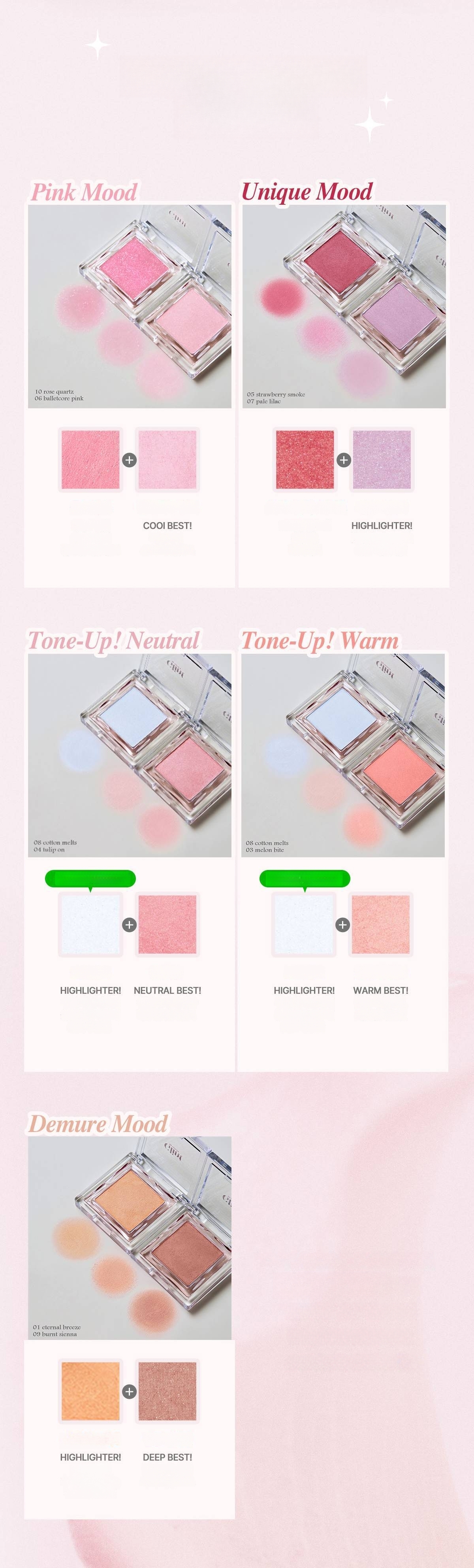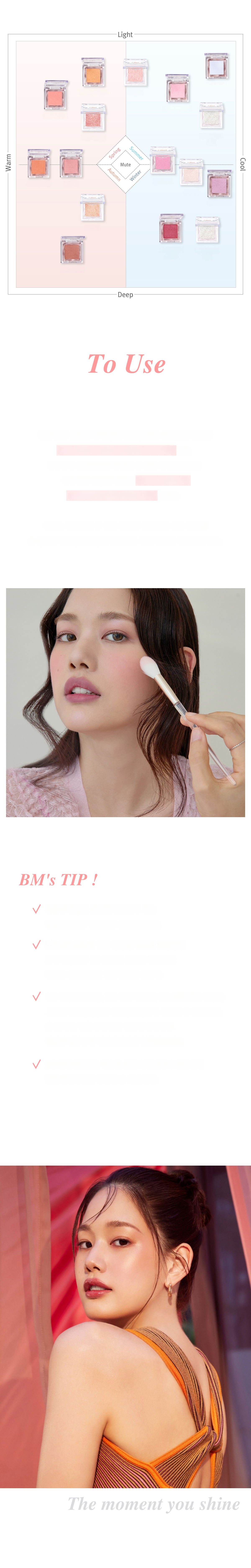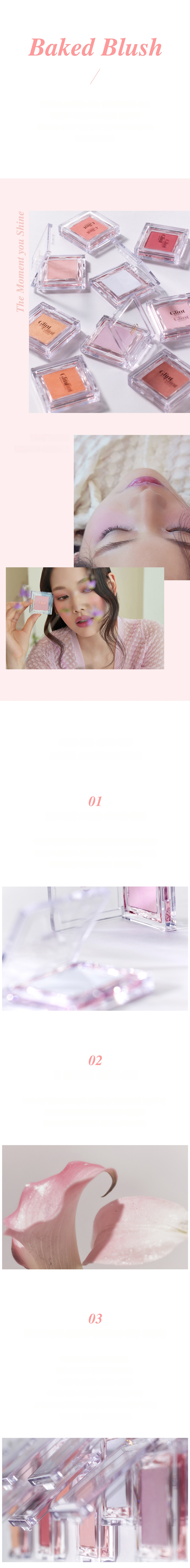 Soft shades complete with fine glitters are baked with moisturizing finish. The ultra fine glitters reflect light to provide delicate glow for three dimensional effect that is never too much. Consists of various color spectrum with diverse lights and shades. The ultrafine glitters provide delicate mood for luxurious sheen.