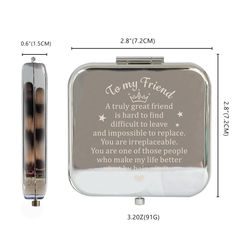 - Unique Birthday Gift For Your Best Friend: This mirror with the words "To My Friend, A truly great friend is hard to find, difficult to leave and impossible to replace. You are irreplaceable. You are one of those people who make my life better just by being in it. Thank you." engraved on the front will make a ideal gift for a best friend! Every her birthday, Christmas or some day with special meaning, this gorgeous gift can be given to a friend to show how much you love her with this unique little mirror!